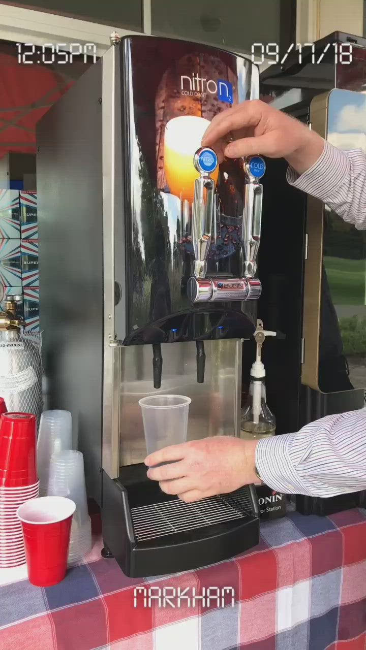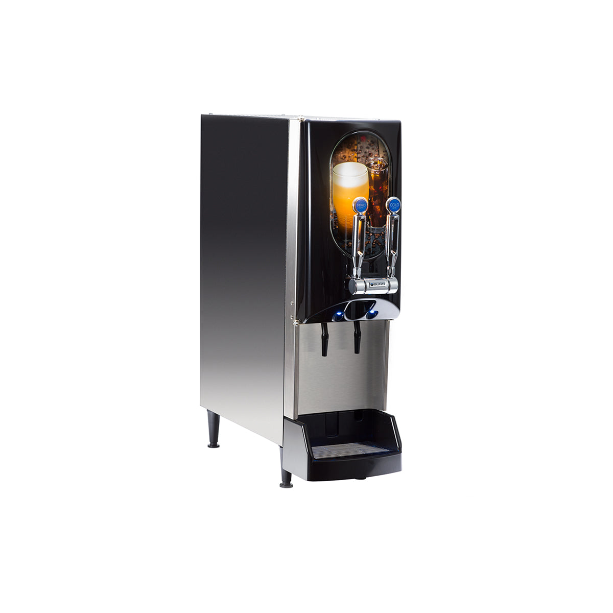 Cold Brew & Nitro Coffee at your finger tips. If you have been looking for a keg-free cold brew and nitro coffee machine, this may be a great option for you! The narrow footprint includes a Graphic panel on the LED-lighted door that can easily be changed - without tools- to promote unique brands or beverage offerings. Serve two different coffees or teas as a nitrogenated beverage using 1- gallon concentrate BIBs or refillable containers. The patented gas infusion technology can produce up to 3 minutes of cascading micro-bubbles resulting in a nitro cold brew crowned with a smooth, silky, stout-like head. The high intensity mixing chamber ensures a perfectly blended, distinctively creamy finish with a velvety mouth feel. Chrome plated brass tap handles are interchangeable with custom handles if you like to create a custom look. Automatic water bath fill maintains water bath level for optimal cold beverage capacity and a flashing red LED light on the door alerts the operator when to refill or change out the nitrogen tank. At a rate of one 16oz drink per minute, each unit can dispense 60 drinks before exceeding 41°F (75°F incoming water). The refrigerated product cabinet ensures flavor integrity and product life and the service-friendly design makes set-up and maintenance a breeze.