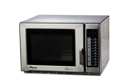 The powerful 1800W Amana RFS18TS commercial microwave oven is packed with features to meet the needs of medium-duty food service operations, from fast casual and family restaurants to bars, grills, and schools! Five power levels plus the ability to program up to 100 different menu items combine with 2 magnetrons that each have a rotating antenna for even heating throughout the cavity to ensure that you enjoy even cooking and consistent food quality every time. This unit is also stackable, so you can add multiple units without sacrificing valuable countertop space.This commercial microwave features a 1.2 cubic foot capacity, while the stainless steel exterior and interior with a sealed ceramic shelf and removable splatter shield enable easy cleanup. For simple and efficient operation, this unit features a unique ergonomic door handle that can be opened with one finger even when your hands are full!