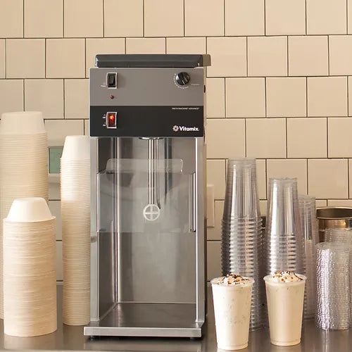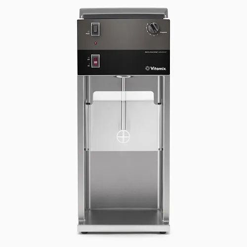 The Vitamix Commercial 020001 Mix'n Machine® frozen dessert machine is equipped with a permanent, cone-shaped agitator for soft serve. This unit is made for countertops and can mixes cookies, candy, or fruit with frozen yogurt or ice cream. For a consistent and durable speed regardless of product thickness, the machine is constructed with a brushless induction motor, and its protective splash guard can be removed to simplify cleanup.
