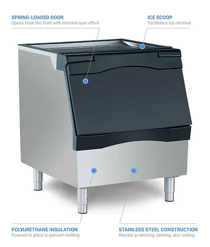 The Scotsman B330P ice storage bin is built for durability and a long life with an exterior of rotocast plastic. The Scotsman ice bin has forced-foam, polyurethane insulation between the wall and liner to preserve a long-lasting ice supply. This ice bin is an ideal match to Prodigy Plus® cube ice machines and some other Scotsman ice machines. The polyethylene interior liner of the bin resists scratching and is easy to clean.