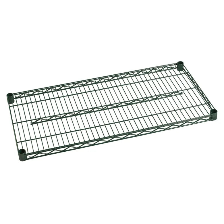 The Focus FF1436 shelf features a wire construction that inhibits dust accumulation by promoting continuous air circulation. Finished with black/green epoxy, it holds up well in dry settings but should not be exposed to the humidity of walk-in coolers or dishrooms. This shelf measures 36 inches wide by 14 inches deep overall, and it has a weight capacity of 800 pounds.
