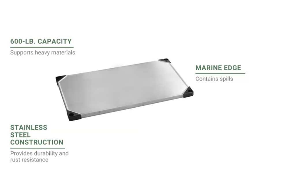 The Focus FF1860SSS shelf is made of stainless steel—a rugged, corrosion-resistant metal well suited to high-volume use. For additional durability, it features die-cast corners with a heavy-duty bolt. With a solid design, the shelf features a marine edge that helps keeps spills contained when storing leaky products. Measuring 60 inches wide by 18 inches deep, this shelf has a 600-pound capacity.