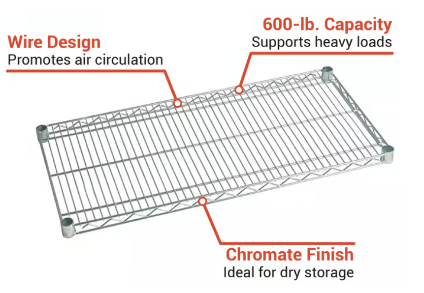 The Focus FF2160C wire shelf's gaps promote air circulation around items stored in dry areas. With increased airflow, the shelf discourages dust buildup. The steel construction is heavy duty, and the chromate finish is durable and easy to clean. This type of finish isn't as corrosion resistant as epoxy alternatives, so it should be used in dry storage instead of wet, humid areas. The unit measures 60 inches by 21 inches and has a 600-pound capacity.