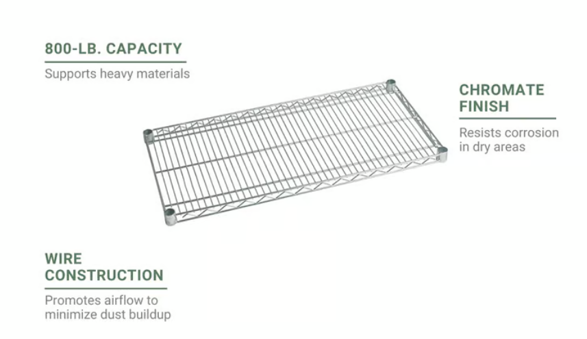 Suitable for storing heavy, dense materials, the Focus FF2424C shelf has a capacity of 800 pounds. Minimizing dust accumulation and simplifying cleanup, its wire design enables air to flow around stored product. It features a chromate finish that provides durability and corrosion defense in dry settings, though in humid areas, it's susceptible to deterioration over time. This shelf measures 24 inches wide by 24 inches deep.