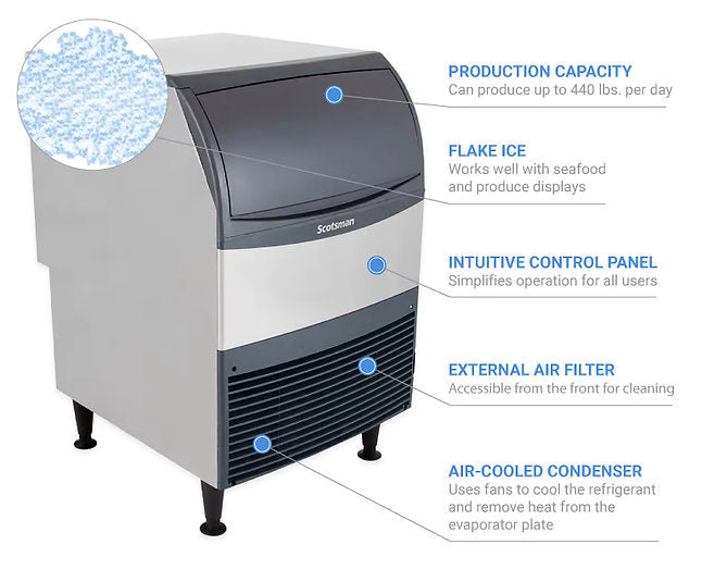 The Scotsman UF424A-1 undercounter flake ice machine can produce 440 pounds of ice every 24 hours; this amount depends on ambient air and incoming water temperatures, making less ice with hotter levels. It produces flake ice, which is a great ice type for fruit, vegetable, and seafood displays. Air-cooled units such as this are easier to install than water-cooled or remotely cooled units.