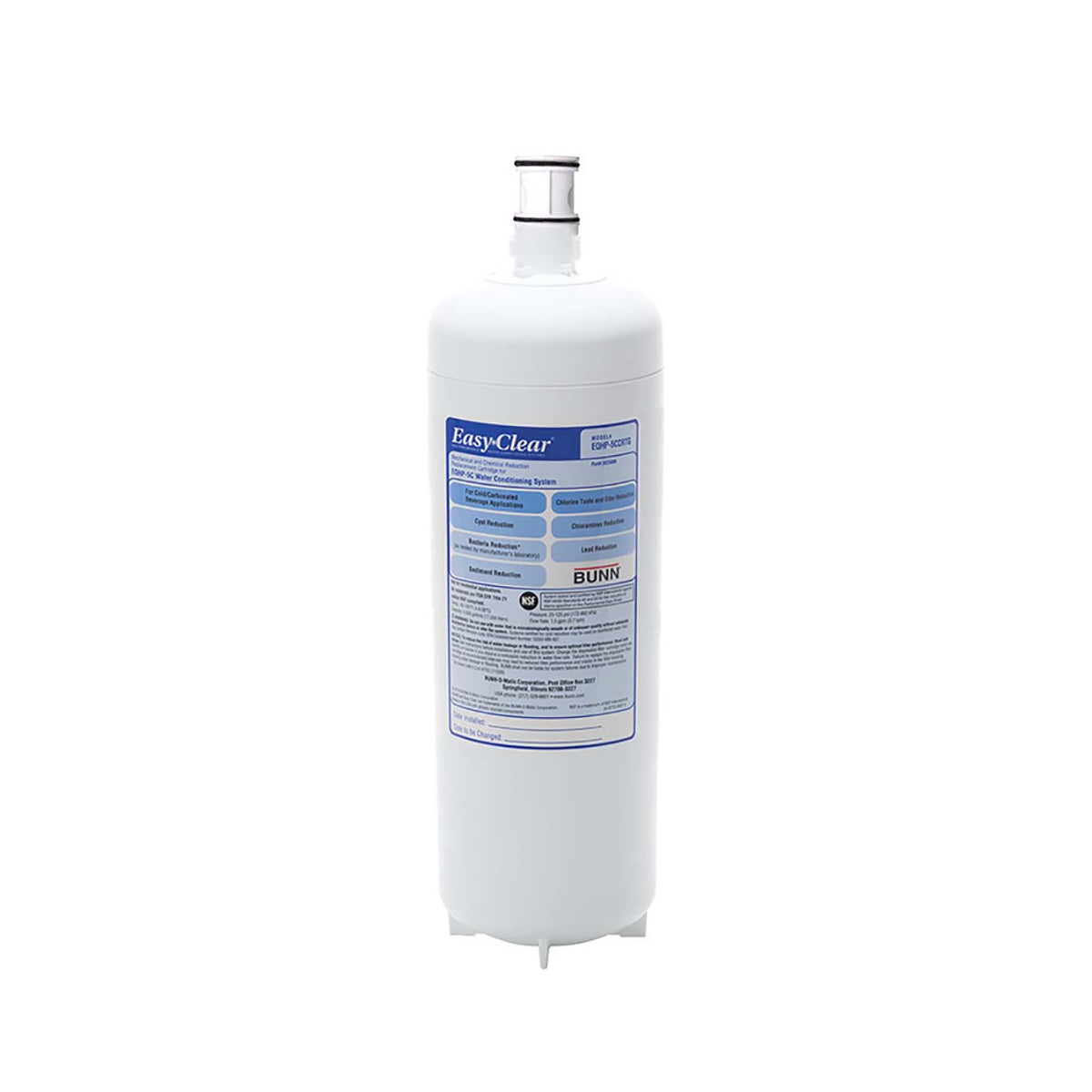 Use this Bunn EQHP-5CCRTG single water filter cartridge for the Bunn EQHP-5C Easy Clear water filter to ensure that your brewed drinks are at their peak. This water filter cartridge reduces impurities including particulate, chloramines, the taste and odor of chlorine, and lead particles. This filter cartridge also helps remove any cyst and bacteria growth in the water supply. This creates safer, cleaner, and better-tasting water.