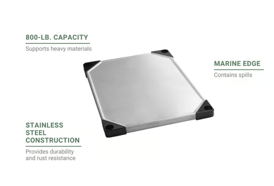 With its 800-pound holding capacity, this Focus FF2448SSS solid shelf has a 48-inch width and 24-inch depth. Designed to hold small items that slip through wire shelf gaps, the surface is solid. It has an integrated marine edge to catch spills and is made durable by die-cast corners and heavy-duty bolts. Because this shelf is made of stainless steel, it's durable and resists corrosion in dry and wet areas. It can be used in traditional pantries or humid dishrooms as well as walk-in coolers and freezers.
