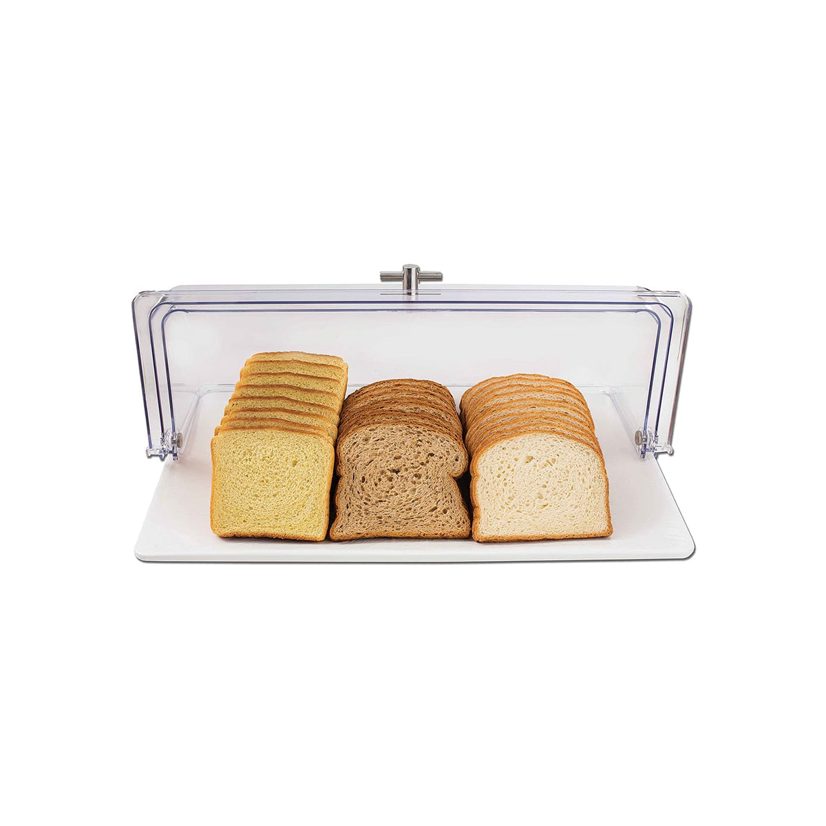 Made out of durable polycarbonate, this cover's construction ensures longevity with high-volume use in your buffet, bakery, or catered event. In addition, a metal handle on the front allows both customers and employees easy access to products. Optimize the taste, texture, and quality of your culinary creations by covering them with this roll top lid!